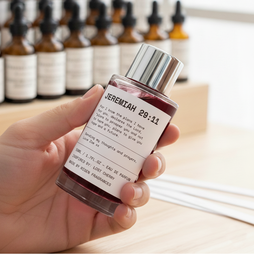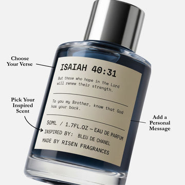 Let’s make it personal. Choose your verse, select a translation (ESV, NIV, NLT, etc.), pick your inspired fragrances, and add a message. Every detail is beautifully printed on the bottle — a faith-inspired gift made just for them.
